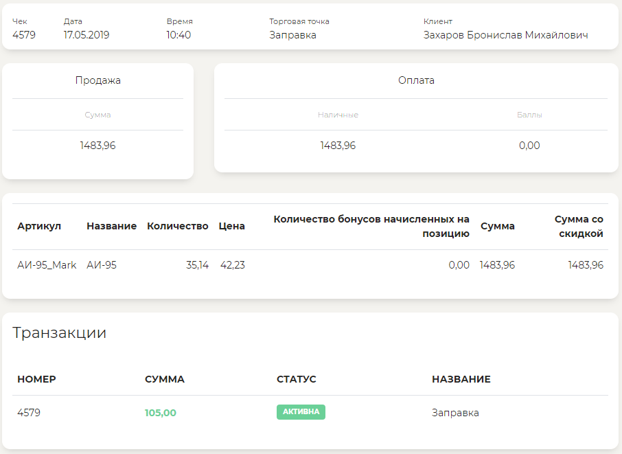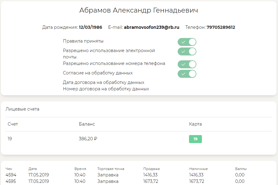 Есть возможность организации личного кабинета клиентов. В личном кабинете можно посмотреть текущее накопление баллов, историю покупок. Клиент может легко получить доступ к кабинету при помощи СМС-авторизации.