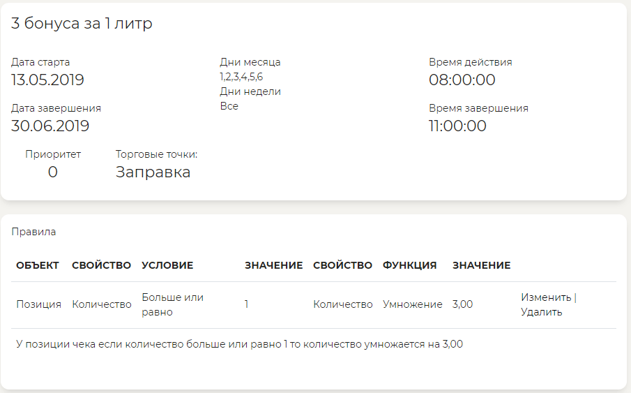 Есть возможность назначать правила начисления и использования бонусных баллов индивидуально для каждой торговой точки или для всей торговой сети.
