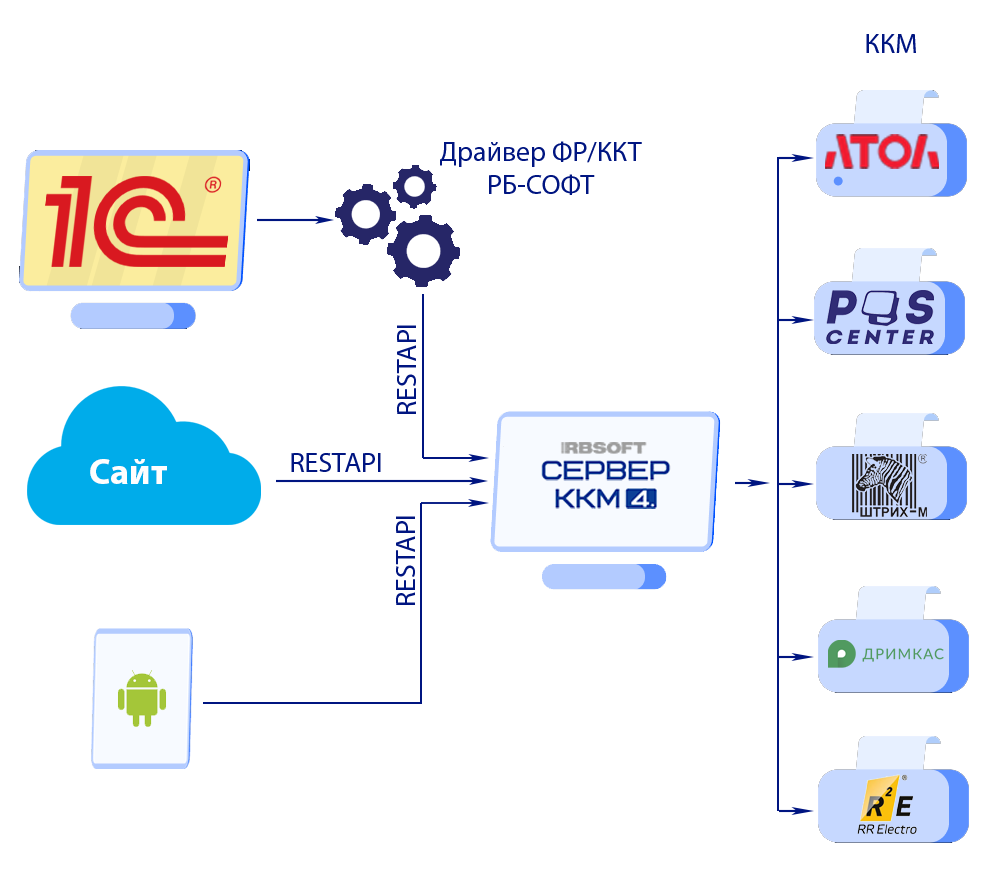Можно всем магазином регистрировать чеки на одном ККМ с отключенной печатью на ленте, а бумажные чеки распечатывать на чековых принтерах. - Сервер предоставляет REST API.