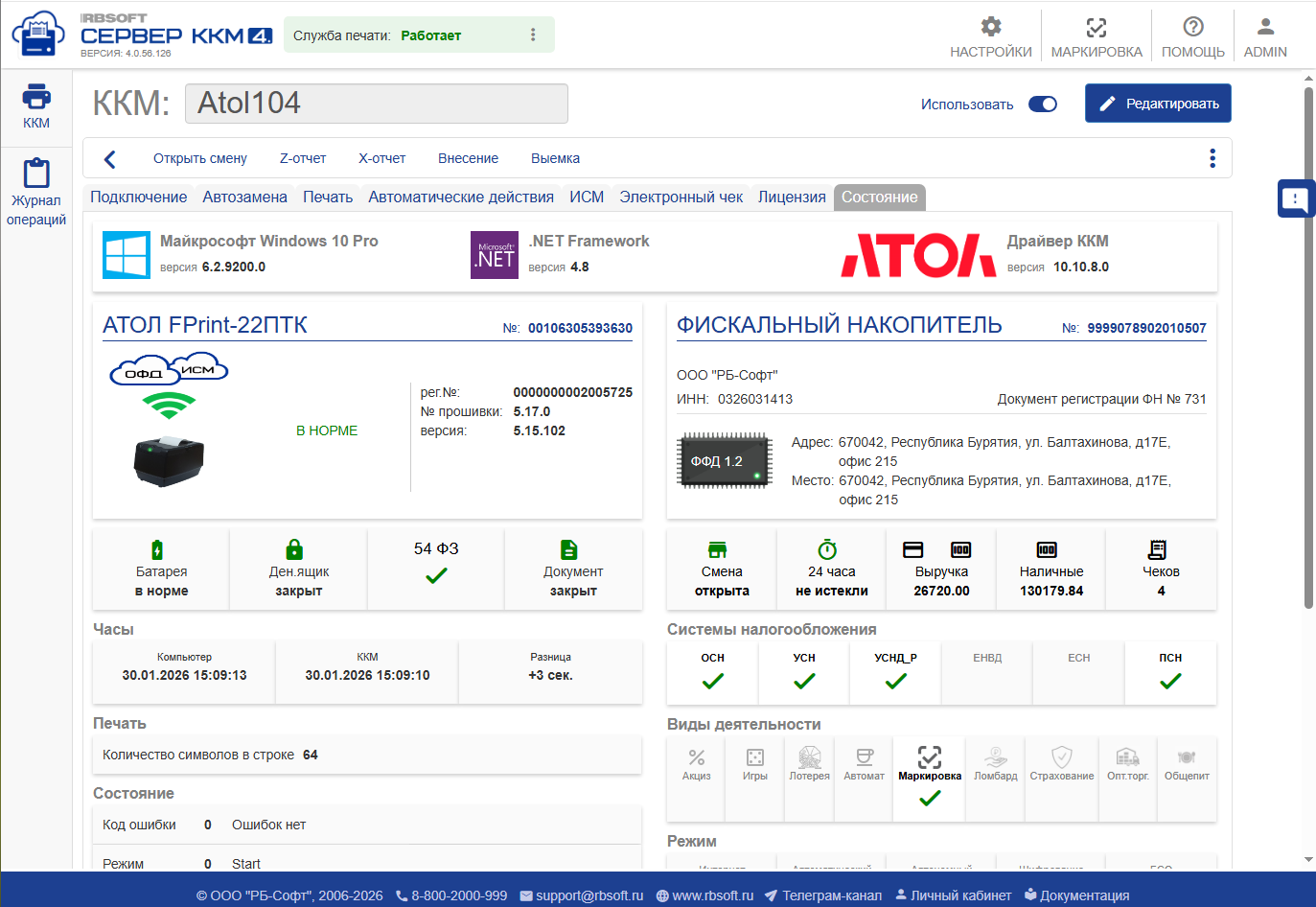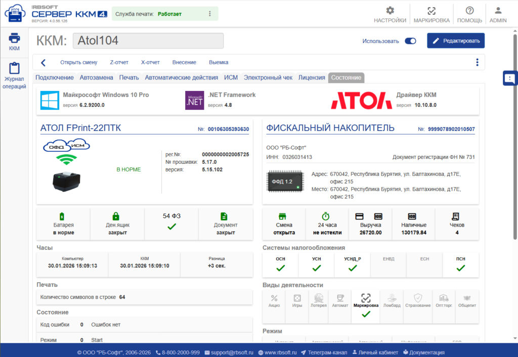 - Версию прошивки ККМ.